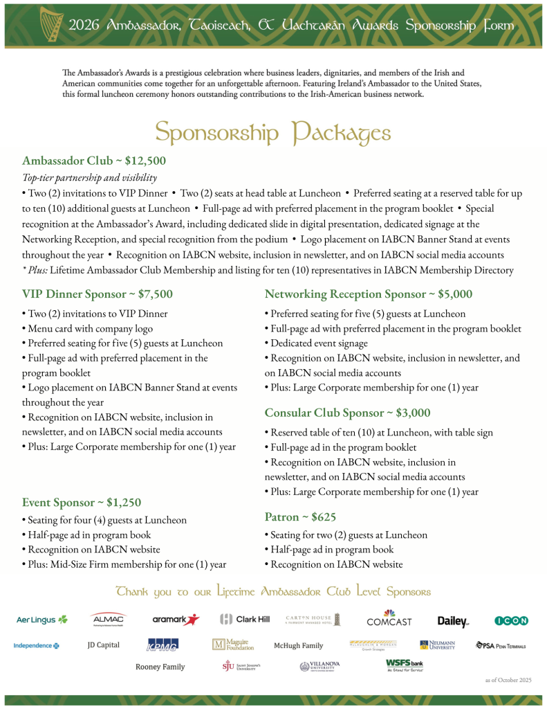 2025 - Kate Shields, Vault Communications; 2024 - Philadelphia GAA; 2023 - John Cummins & Adele Farrell, NEXA | EAM; 2022 - John Furey, Imvax; 2020 - Reverend Peter M. Donohue, OSA, PHD, Villanova University; 2019 - Daniel J. Keating III, Gilbane Building Company & Sarah P. Keating, Esq, Keating Environmental Management; 2018 - Jerry Maginnis, KPMG LLP; 2017- Eileen McDonnell, The Penn Mutual Life Insurance Company; 2016 - Bill & Natalie McLaughlin, McLaughlin & Morgan, Inc.; 2015 - Frank Reynolds, PixarBio; 2014 - Denis P. O’Brien, PECO; 2013 - James and Frances Maguire; Philadelphia Insurance & Maguire Foundation; 2012 - Daniel J. Hilferty, Independence Blue Cross; 2011 - Rev. Timothy R. Lannon S.J., St. Joseph's University; 2010 - Henry J. “Harry” McHugh, Wawa; 2009 - John and Joan Mullen, Apple Vacations; 2008 - James and Jacqueline Delaney, JD Capital; 2006 - Father John McNamee, St. Malachy's Parish