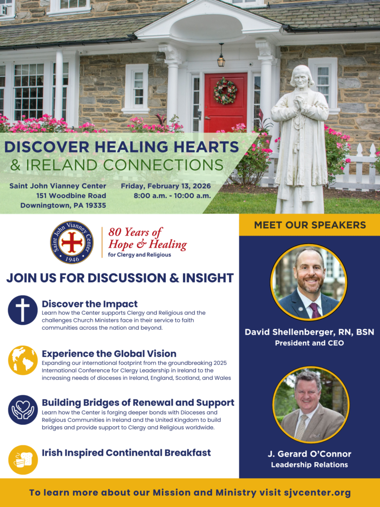 Join us for a morning of inspiration and connection where we’ll shine a light on the extraordinary mission of Saint John Vianney Center, the nation’s premier Catholic behavioral health and wellness center, dedicated to supporting the health and healing of clergy and men and women religious in mind, body, and spirit.
